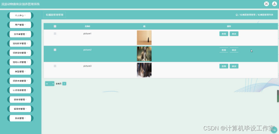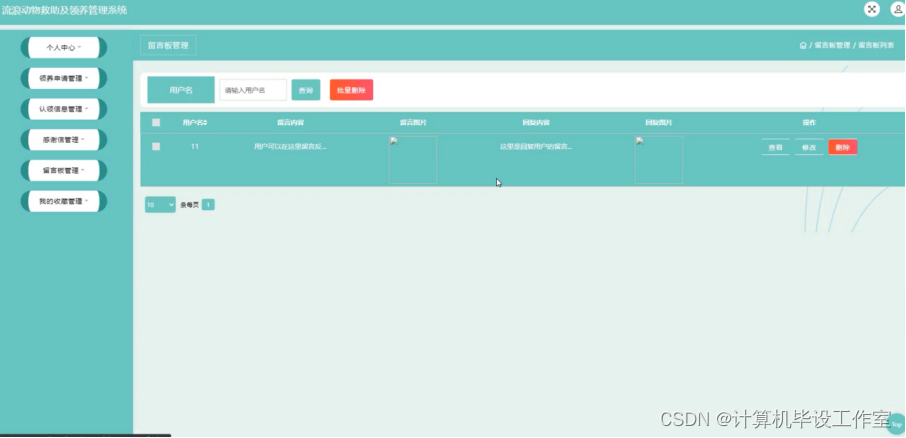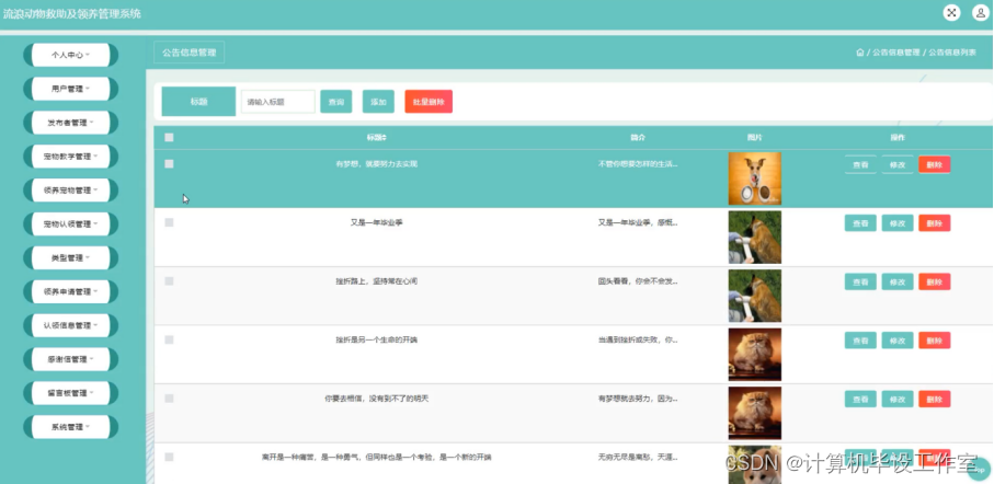 (3)对流浪动物救助及领养管理信息能够进行查询、修改、删除、添加等操作。