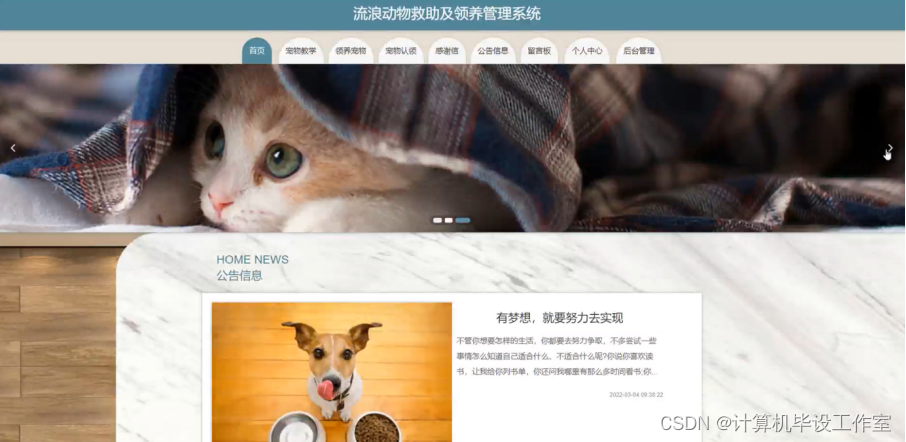 流浪动物救助及领养管理系统,用户进入前台网站查看首页、宠物教学、领养宠物、宠物认领、感谢信、公告信息、留言板、个人中心、后台管理等内容进行操作,如图4-1所示。