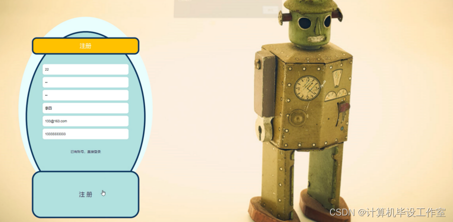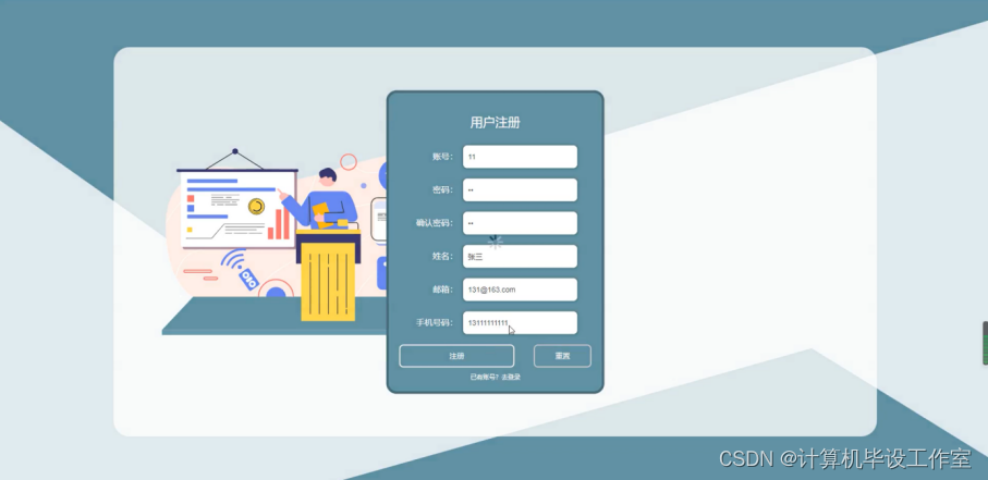 用户注册;在用户注册页面中输入账号、密码、确认密码、姓名、邮箱、手机号码等内容进行注册操作;如图4-2所示。