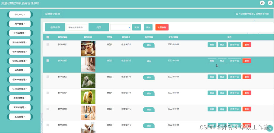 宠物教学管理;在宠物教学管理页面中可以查看教学名称、教学封面、类型、教学简介、教学视频、发布者日期等内容,并进行查看、修改、查看评论和删除等操作;如图4-11所示。