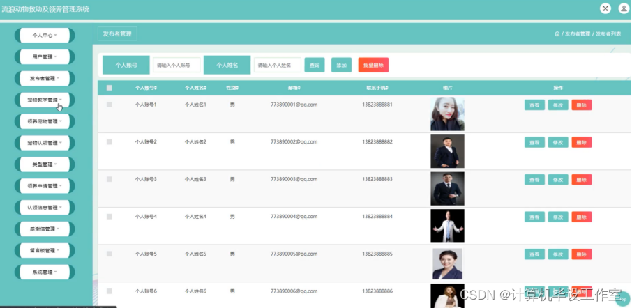 发布者管理;在发布者管理页面中可以查看个人账号、个人姓名、性别、邮箱、联系手机、相片等内容,并进行查看、修改和删除等操作;如图4-10所示。