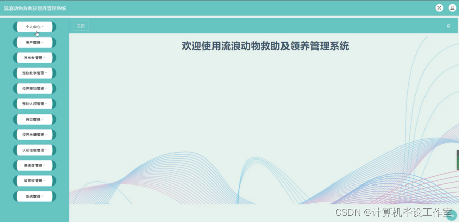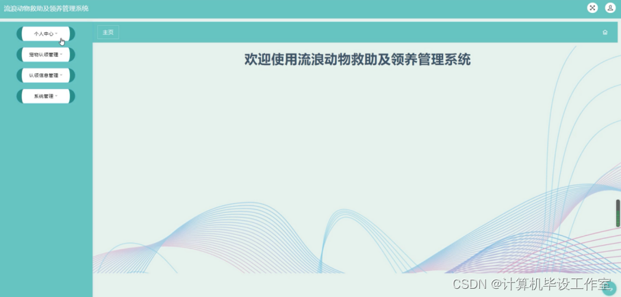 发布者登录进入流浪动物救助及领养管理系统后可以查看个人中心、宠物认领管理、认领信息管理、系统管理等内容,如图4-21所示。