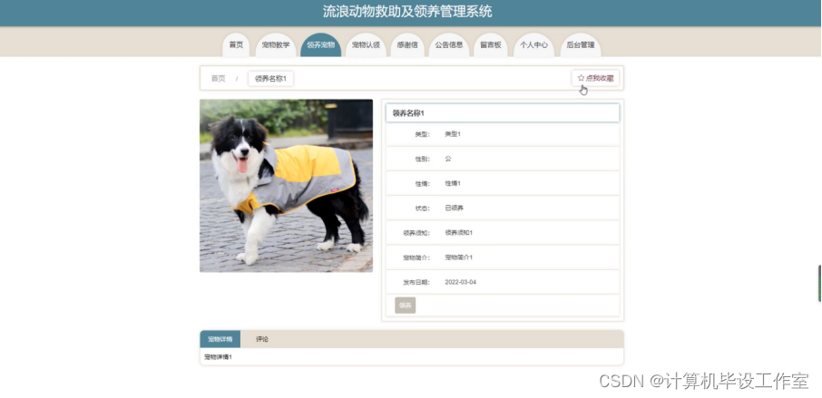 领养宠物;在领养宠物页面可以填写领养名称、宠物图片、类型、性别、性情、状态、领养须知、宠物简介、发布日期等内容,并进行领养、点我收藏、评论等操作;如图4-5所示。