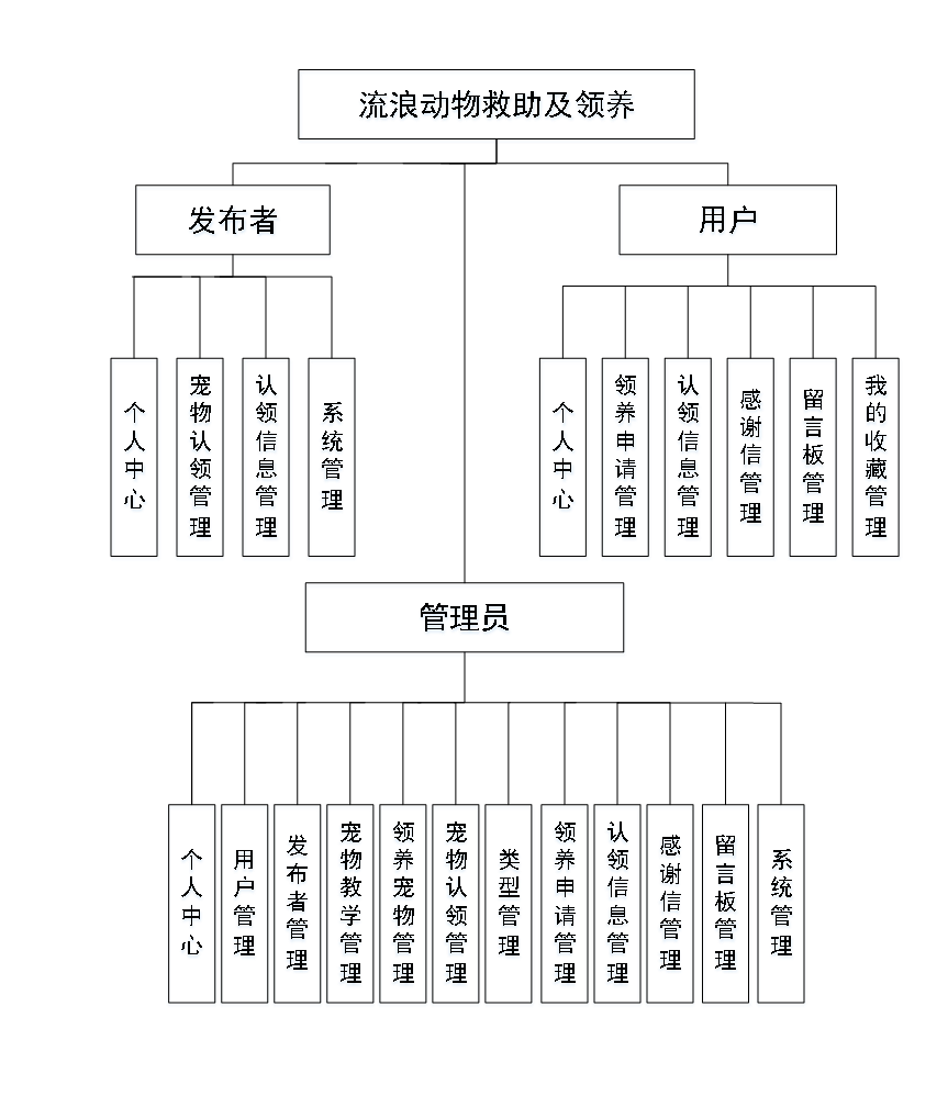 后台主要是管理员,管理员功能包括个人中心,用户管理、发布者管理、宠物教学管理、领养宠物管理、宠物认领管理、类型管理、领养申请管理、认领信息管理、感谢信管理、留言板管理、系统管理等;