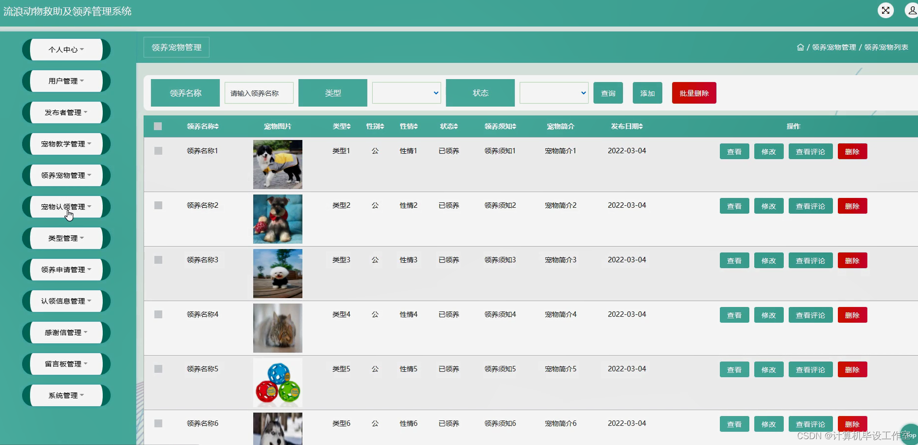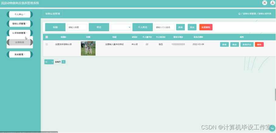 宠物认领管理,在退宠物认领管理页面查看标题、封面、特征、状态、个人账号、个人姓名、联系手机、发布日期等信息进行查看、修改、查看评论、删除等操作,如图4-23所示。