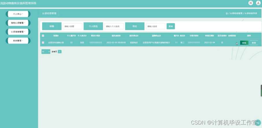 认领信息管理,在认领信息管理页面查看标题、个人账户、个人姓名、联系手机、遗失时间、遗失地点、宠物特点、账号、姓名、手机号码、申请日期、是否审核、审核回复等信息进行审核、查看等操作,如图4-22所示。