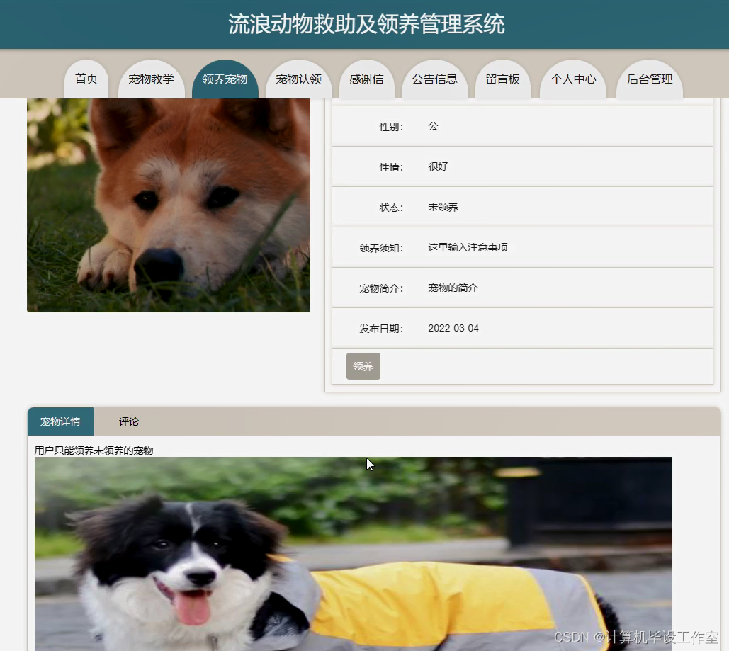 (5)宠物领养页面,查看管理员发布的宠物领养信息列表,点击查看宠物详情,提交领养申请,等待管理员审核,通过后方可领养。