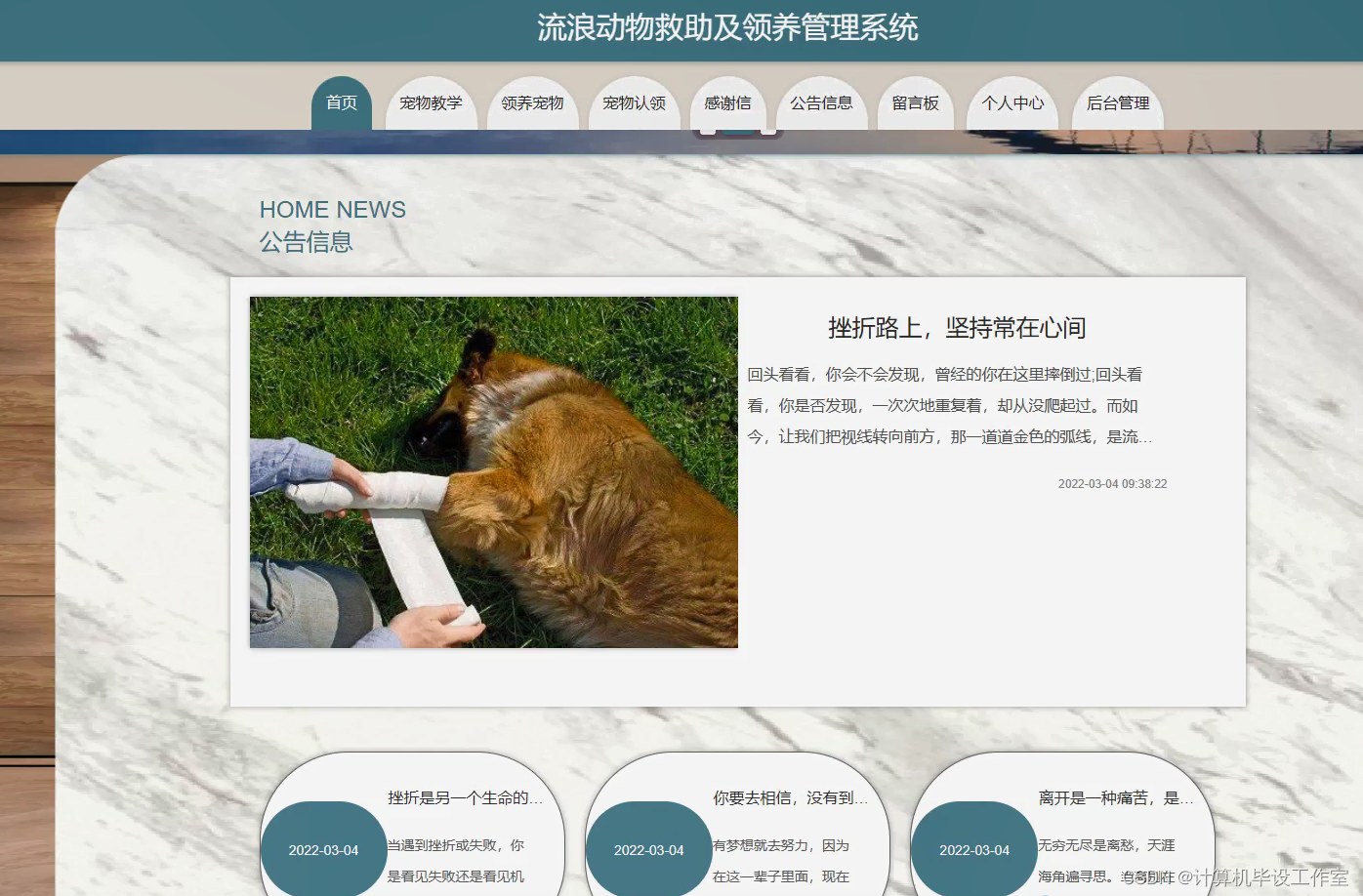 (2)进入首页,轮播图展示宠物图片,查看通知公告,查看感谢信模块。