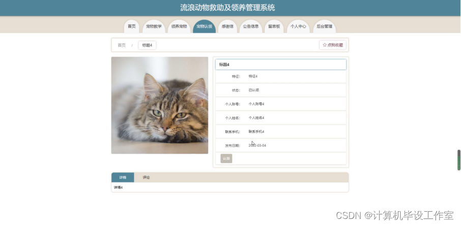 宠物认领;在宠物认领页面可以填写标题、封面、特征、状态、个人账号、个人姓名、联系手机、发布日期等内容,并进行认领、点我收藏、评论等操作;如图4-6所示。