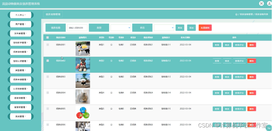 领养宠物管理;在领养宠物管理页面中可以查看领养名称、宠物图片、类型、性别、性情、状态、领养须知、宠物简介、发布日期等内容,并进行查看、修改、查看评论和删除等操作;如图4-12所示。