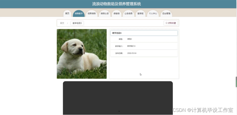 宠物教学;在宠物教学页面中可以查看教学名称、教学封面、类型、教学简介、教学视频、发布者日期等内容,还可以进行点我收藏等操作,如图4-4所示。