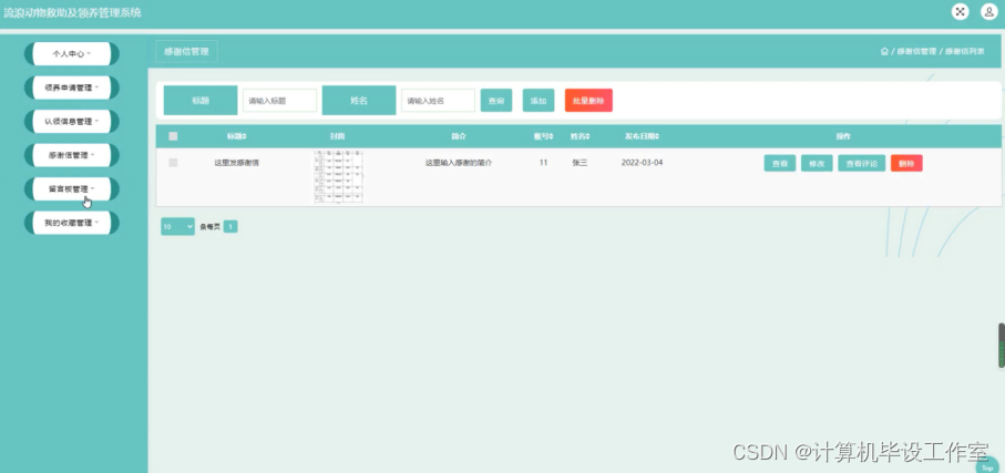 感谢信管理,在感谢信管理页面查看标题、封面、简介、账号、姓名、发布日期内容、进行查看、修改、查看评论、删除等操作,如图4-18所示。