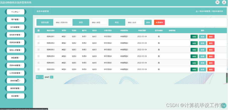 领养申请管理;在领养申请管理页面中可以查看领养名称、类型、性别、账号、姓名、手机号码、申请原因、申请日期、是否审核、审核回复等内容,并进行审核、查看、删除等操作;如图4-13所示。