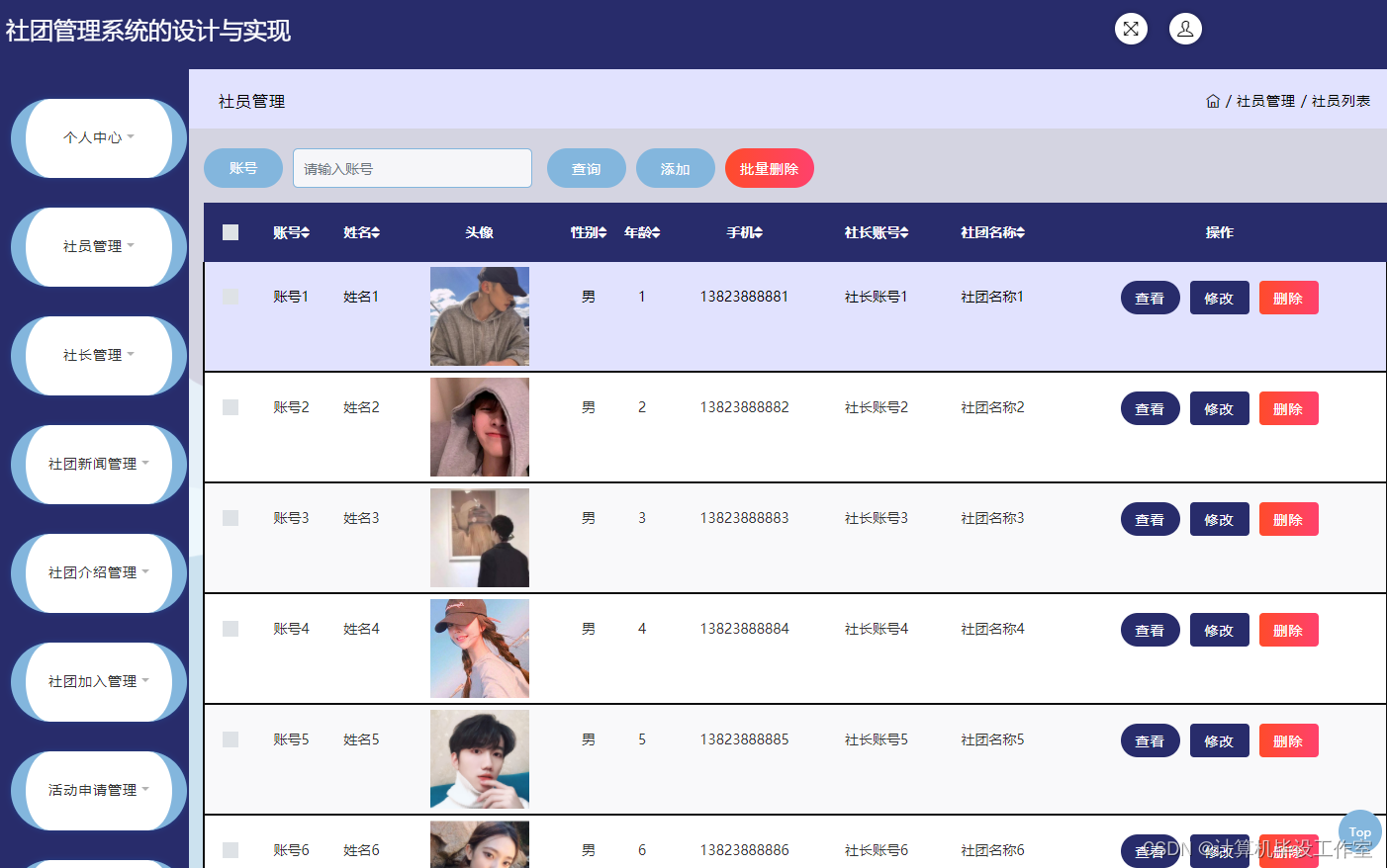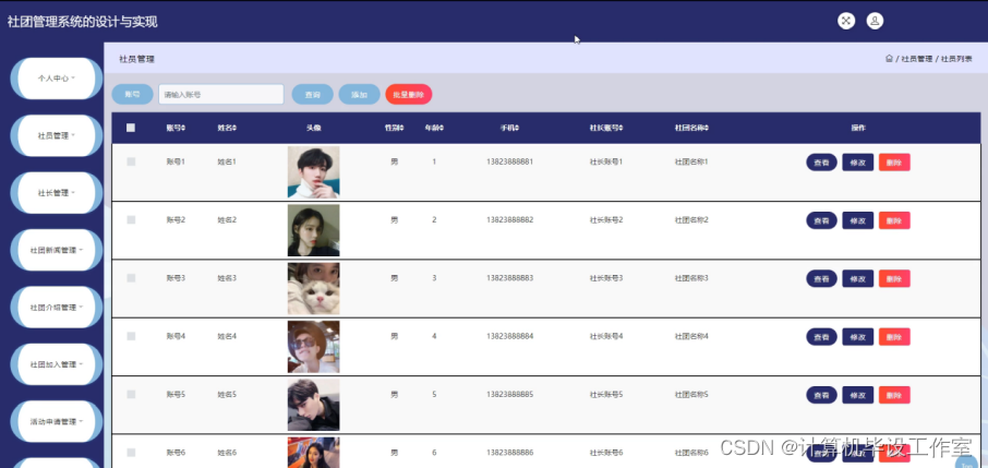 社员、社团管理模块:管理员查询社长、社员信息,可对其添加删除、修改等功能。