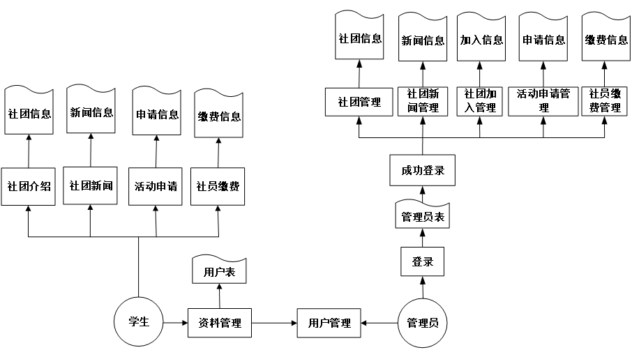 业务流程图不仅能反映出内部业务之间的关系,而且能体现出作业顺序及信息的流动。社团管理系统必须支持整个组织在不同层次上的各种功能,各个功能模块之间又有各种不同相关的信息进行联系,构成了一个有机的整体,根据社团管理的特点以及结合所面临的实际情况,设计出了系统的业务流程图。