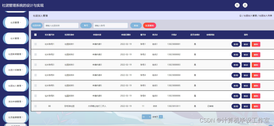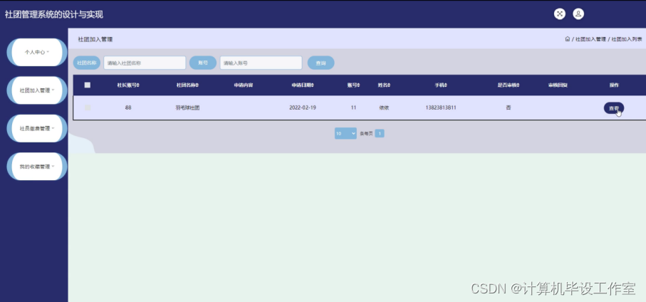 社团加入模块:社员申请加入社团,社长可以进行查看以及审核。