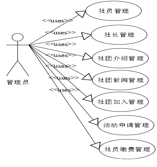 系统管理员可以进行社员管理、社长管理、社团管理、社团新闻管理、社团介绍管理、社团加入管理、活动申请管理、社员缴费管理