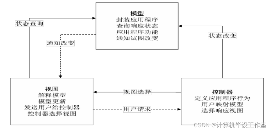 页面发送请求给控制器,控制器调用业务层处理逻辑,逻辑层向持久层发送请求,持久层与数据库交互,后将结果返回给业务层,业务层将处理逻辑发送给控制器,控制器再调用视图展现数据。