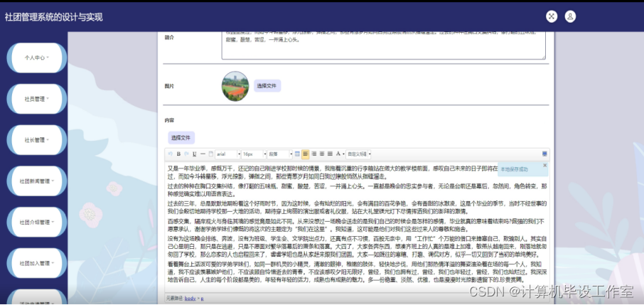社团新闻管理模块:新闻标题的增加、删除、修改等功能。