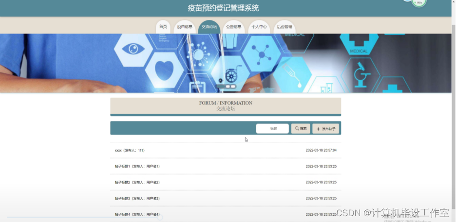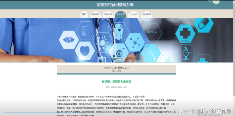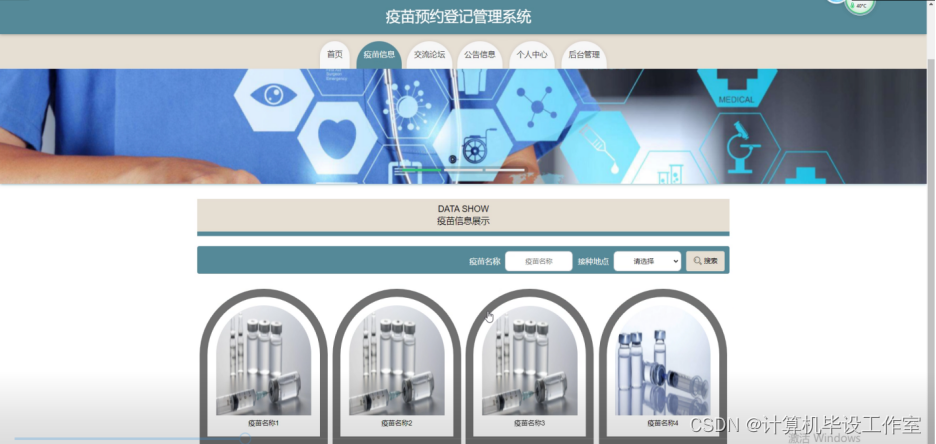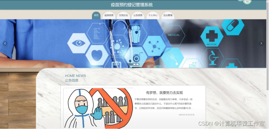 (2)查看疫苗预约登记管理系统的首页信息:疫苗预约登记管理系统的首页信息包含了首页、疫苗信息、公告信息、交流论坛等。