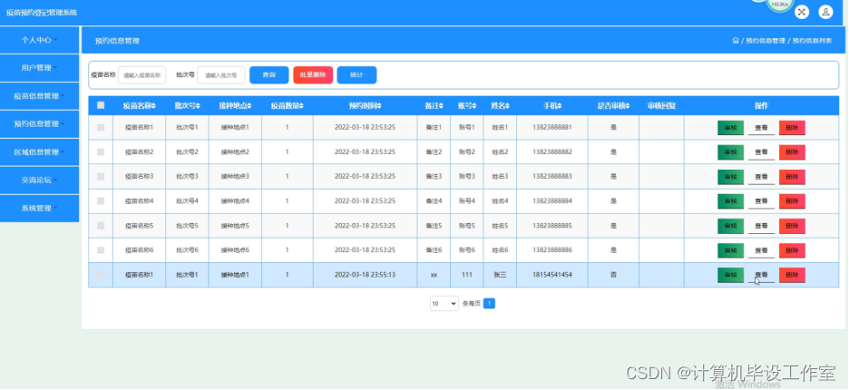 (4)预约信息管理:在“预约信息管理”这一菜单下,我们会看到所有用户提交的疫苗预约信息,管理员可以对其进行处理操作。