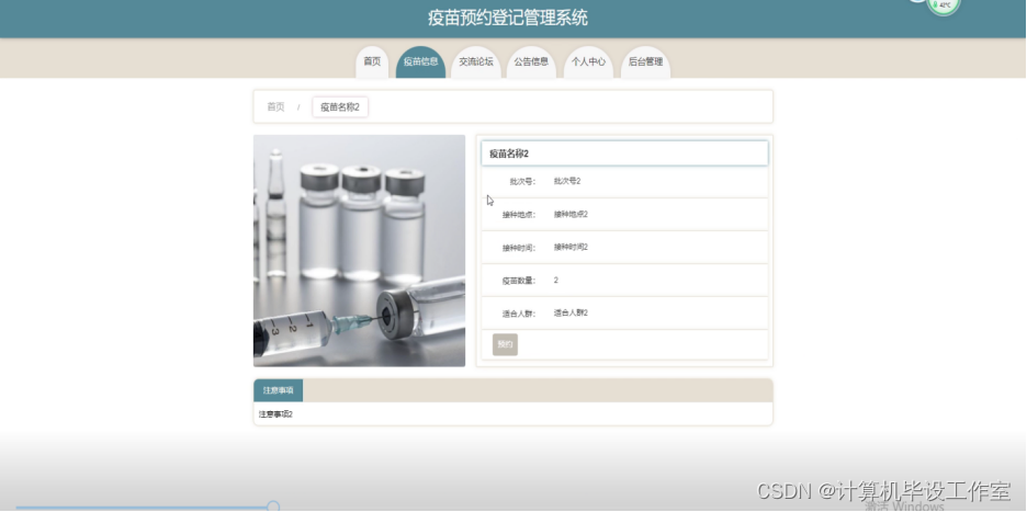 (2)疫苗管理:用户通过系统查看疫苗信息、注意事项、接种时间、适合人群、疫苗状态等。