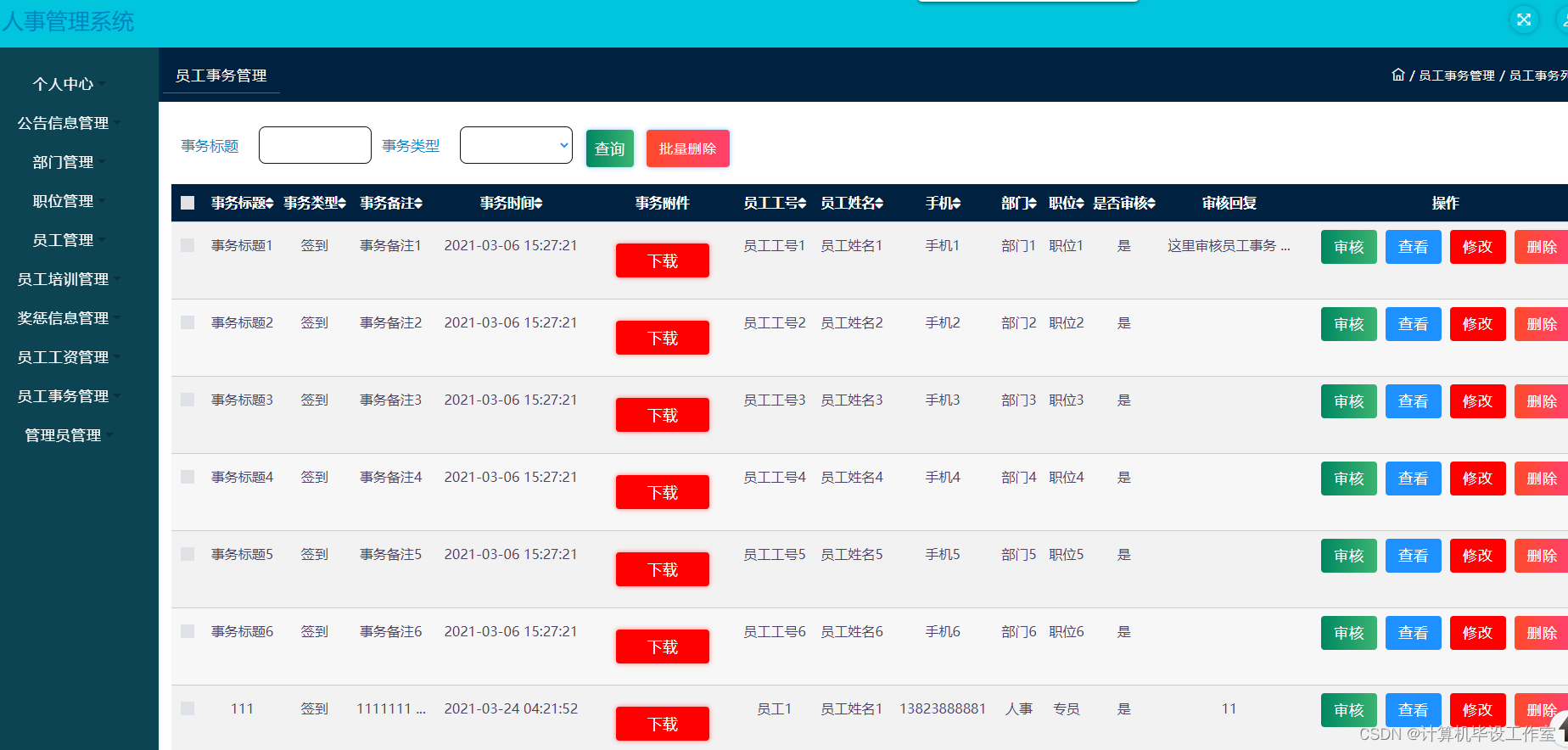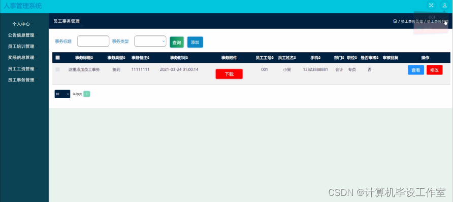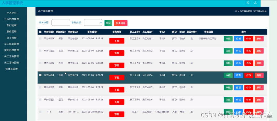 员工事务管理,在员工事务管理页面中通过填写事务标题 、事务类型、事务备注、事务时间、事务附件、员工工号、员工姓名、手机、部门、职位、是否审核、审核回复等内容进行修改、删除,如图5-12所示。