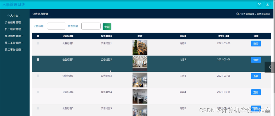 公告信息管理,在公告信息管理页面中通过填写公告标题、公告类型、图片、内容、发布日期等信息,还可以根据需要对公告信息管理进行查看如图5-9所示。