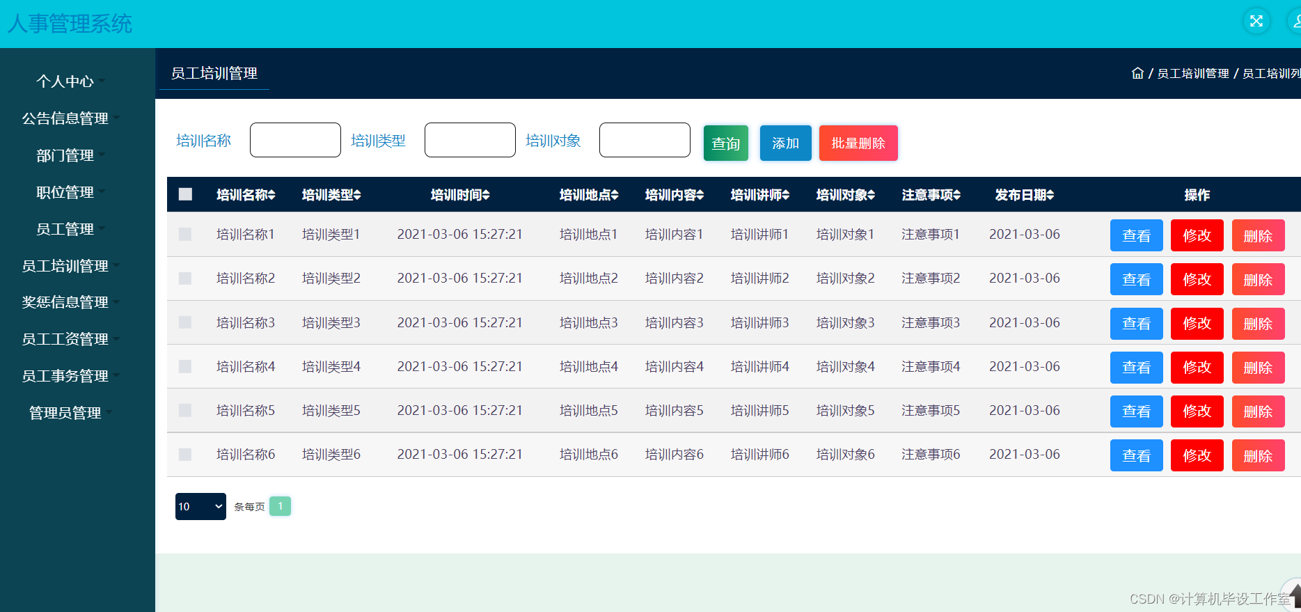 员工培训管理,在员工培训管理页面中可以查看培训名称、培训类型、培训时间、培训地点、培训内容、培训讲师、培训对象、注意事项、发布日期等内容,并且根据需要对已有员工培训管理进行详情,修改或删除等详细操作,如图5-6所示。