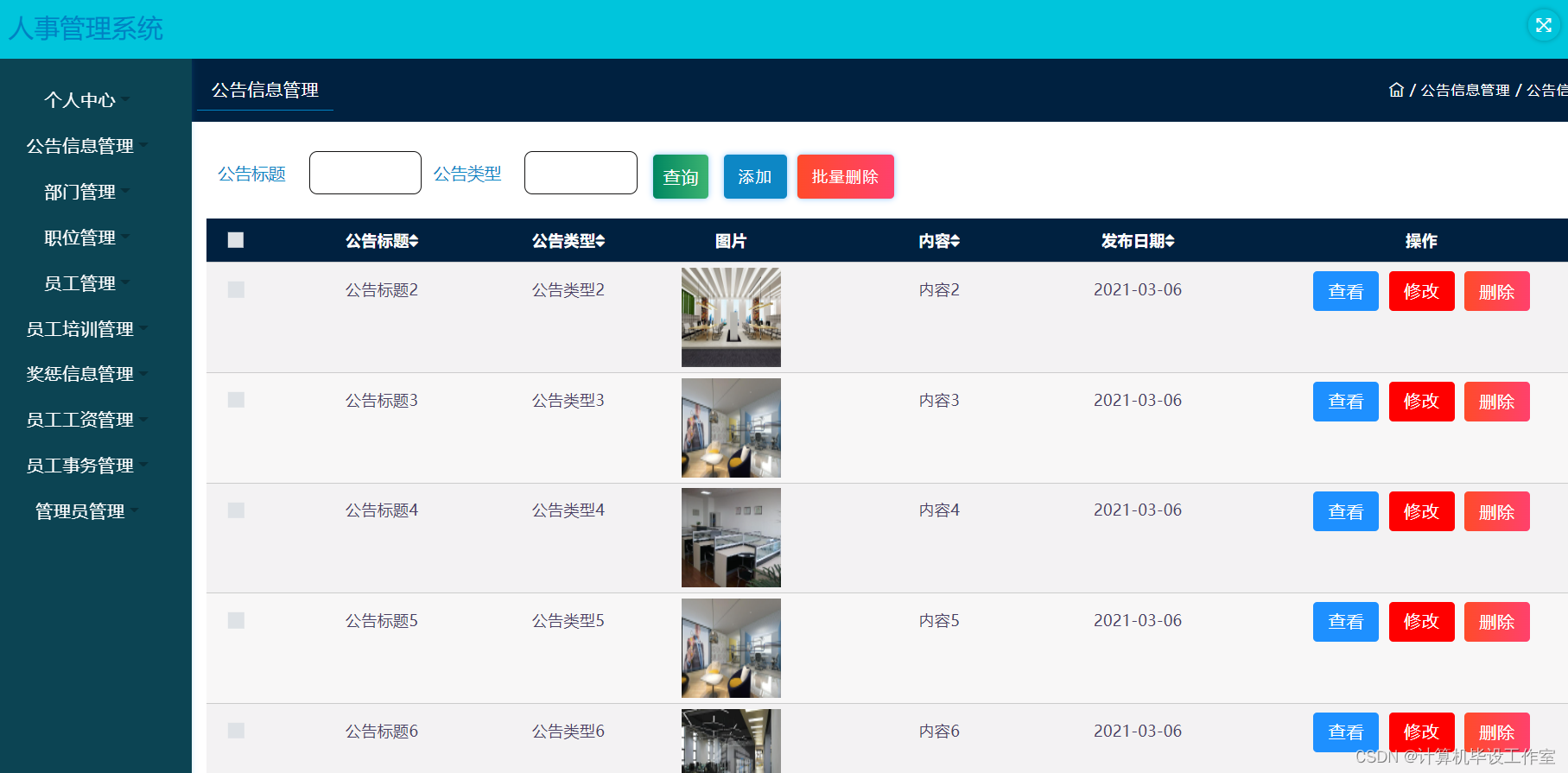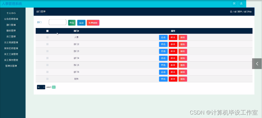 管理员用户可以进行个人中心管理(修改密码,个人信息修改),公告信息管理,职位管理,部门管理,员工信息管理,员工培训管理,奖惩信息管理,员工工资管理,员工事务管理