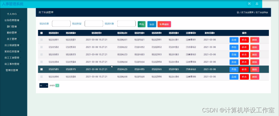 员工培训管理,在员工培训管理页面中可以查看培训名称、培训类型、培训时间、培训地点、培训内容、培训讲师、培训对象、注意事项、发布日期等信息内容,并且根据需要对已有员工培训管理进行修改或删除等其他详细操作,如图5-10所示。
