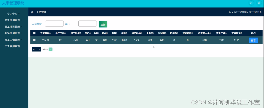 | 1 | 点击员工工资管理查看详情按钮 | 无 | 跳转到员工工资管理详情 | |