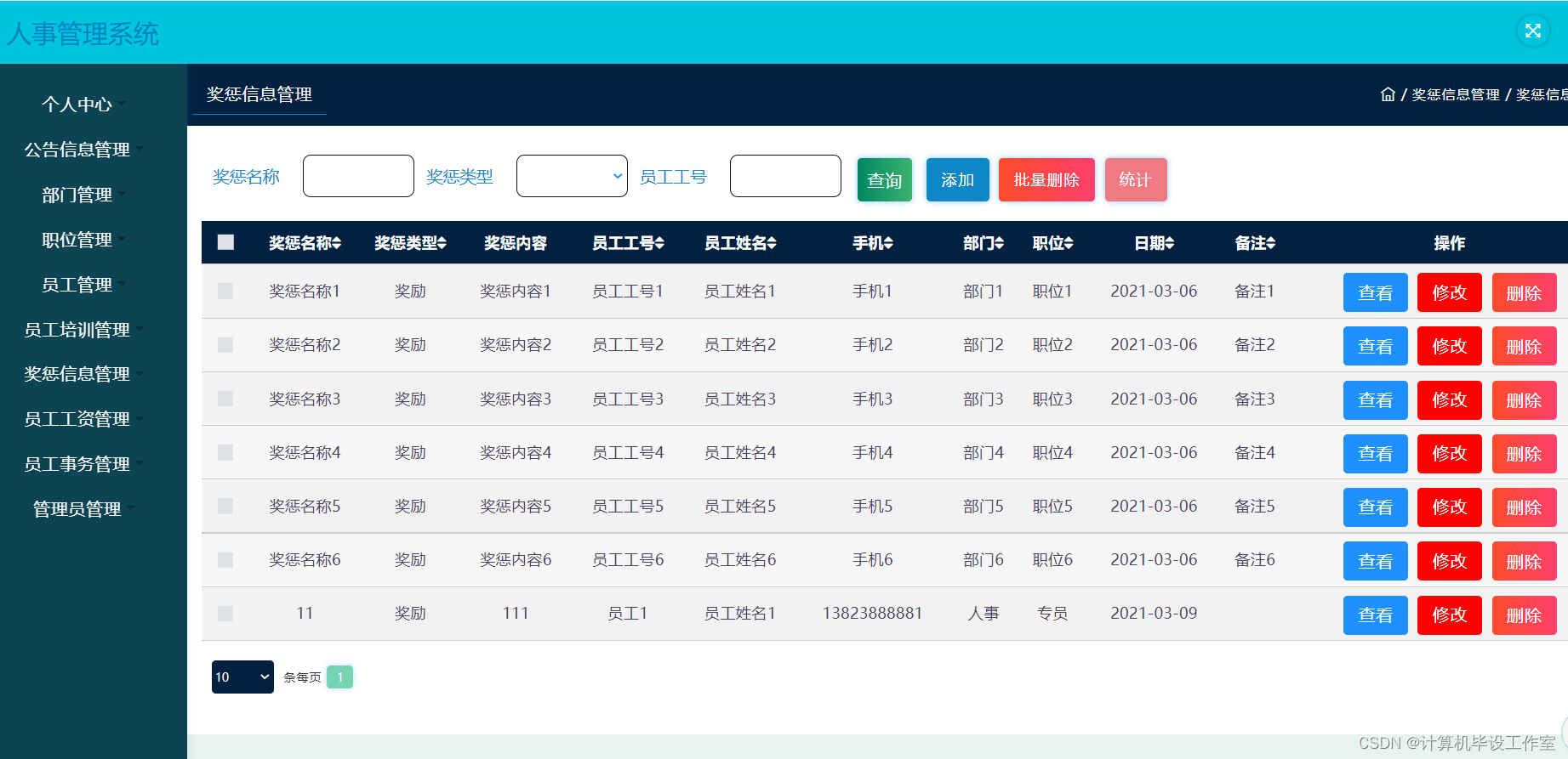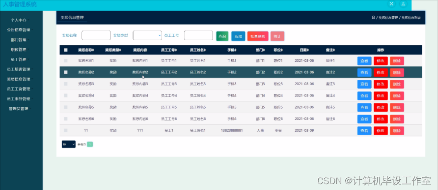 奖惩信息管理,在奖惩信息管理页面中可以查看奖惩名称、奖惩类型、奖惩内容、员工工号、员工姓名、手机、部门、职位、日期、备注等内容,并且根据需要对已有奖惩信息管理进行详情,修改或删除等详细操作,如图5-7所示。