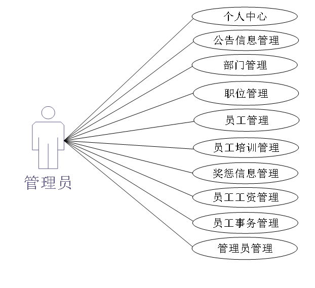 (1)管理员模块:系统中的核心用户是管理员,管理员登录后,通过管理员功能来管理后台系统。主要功能有:个人中心、公告信息管理、部门管理、职位管理、员工管理、员工培训管理、奖惩信息管理、员工工资管理、员工事务管理、管理员管理等功能。管理员用例图如图3-1所示。