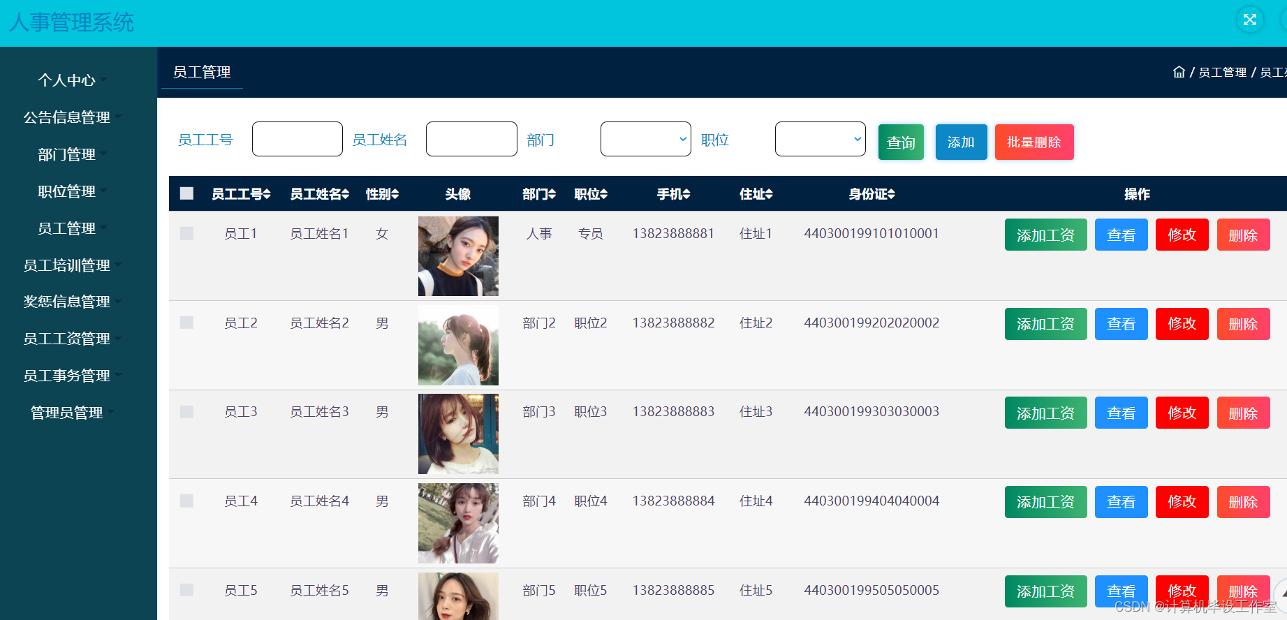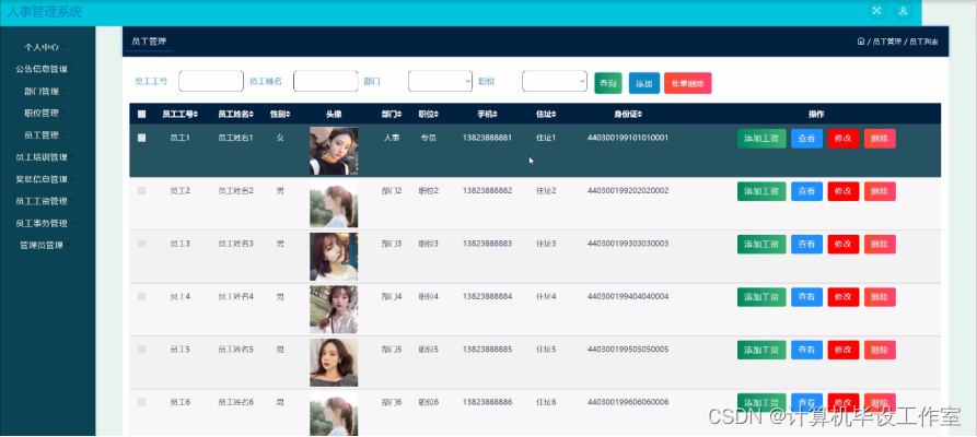 员工管理,在员工管理页面中可以填写员工工号、员工姓名、性别、头像、部门、职位、手机、住址、身份证等信息,并可根据需要对已有员工管理进行修改或删除等操作,如图5-4所示。