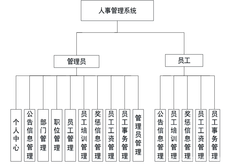 本人事管理系统主要包括二大功能模块,即管理员功能模块和员工功能模块。