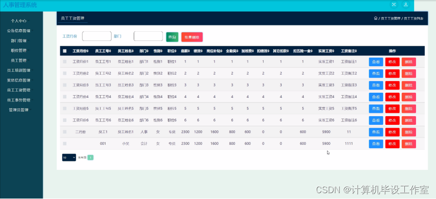 员工工资管理,在员工工资管理页面中通过填写工资月份、员工工号、员工姓名、部门、性别、职位、底薪、绩效、岗位补贴、全勤奖、加班费、扣绩效、其它扣款、扣五险一金、实发工资、工资备注等内容进行修改、删除,如图5-11所示。