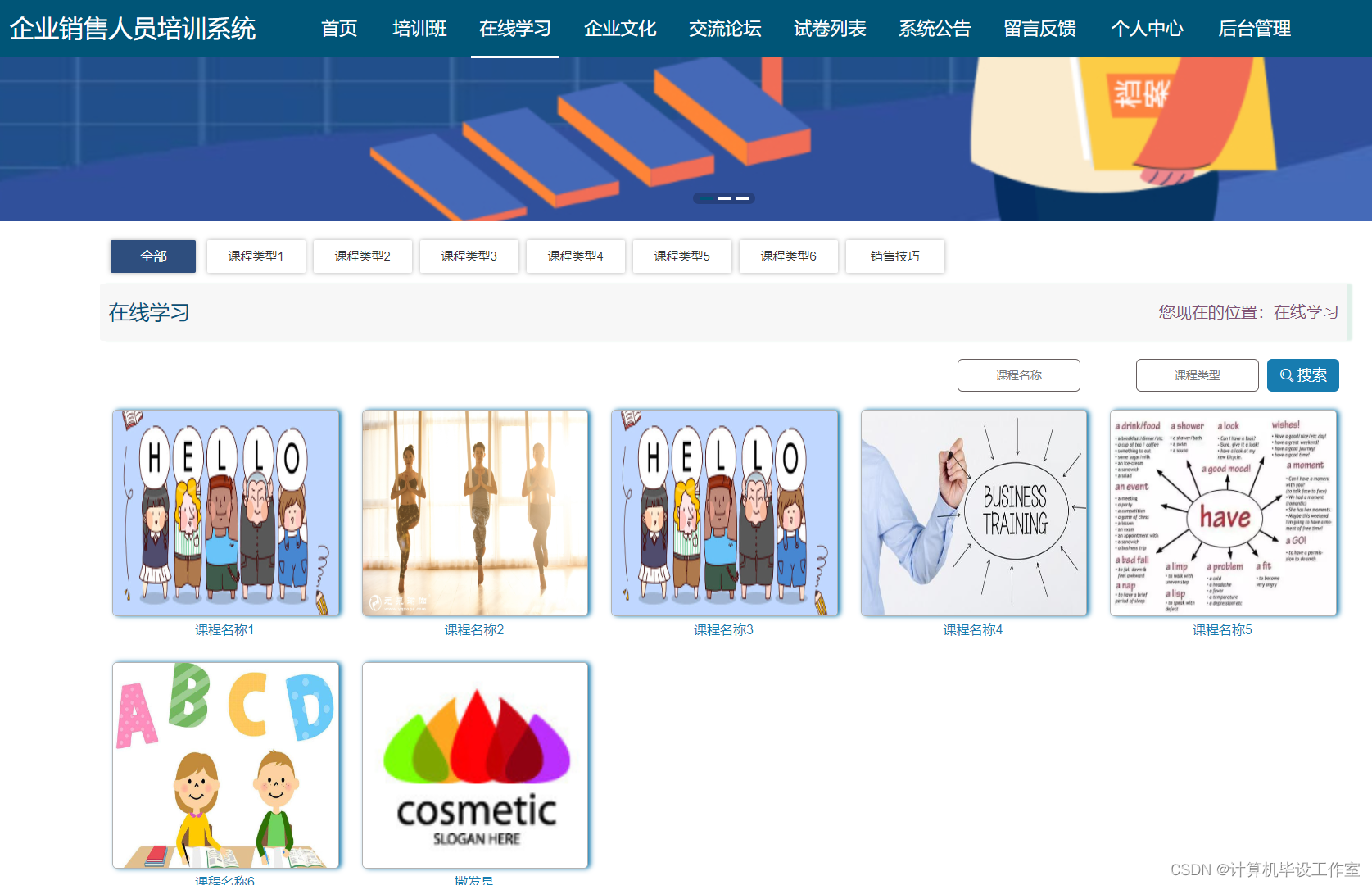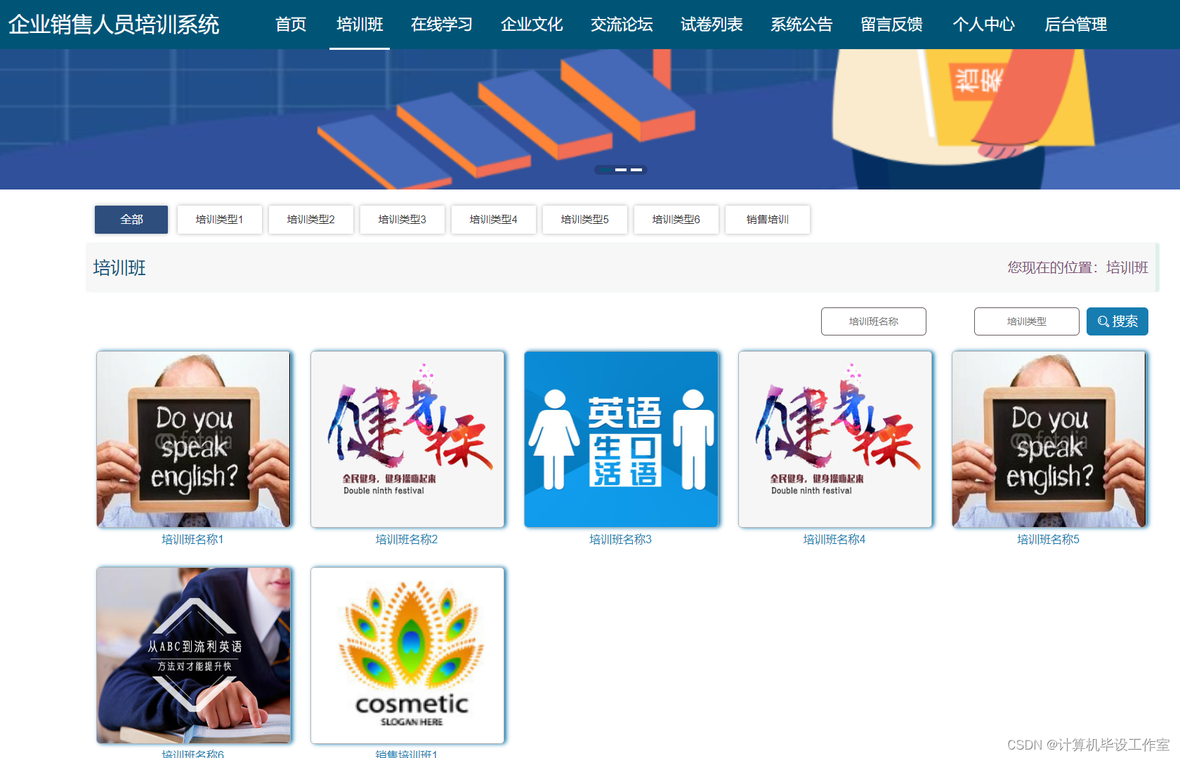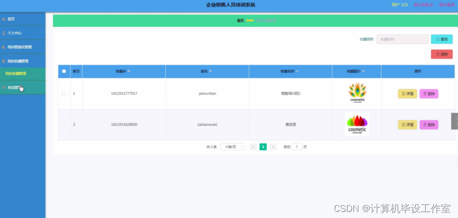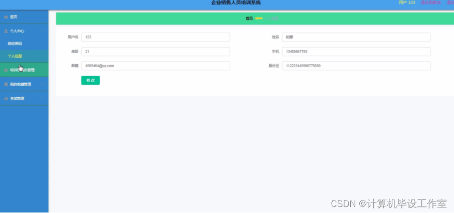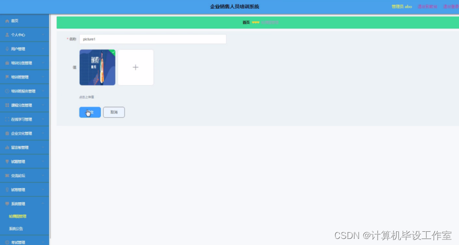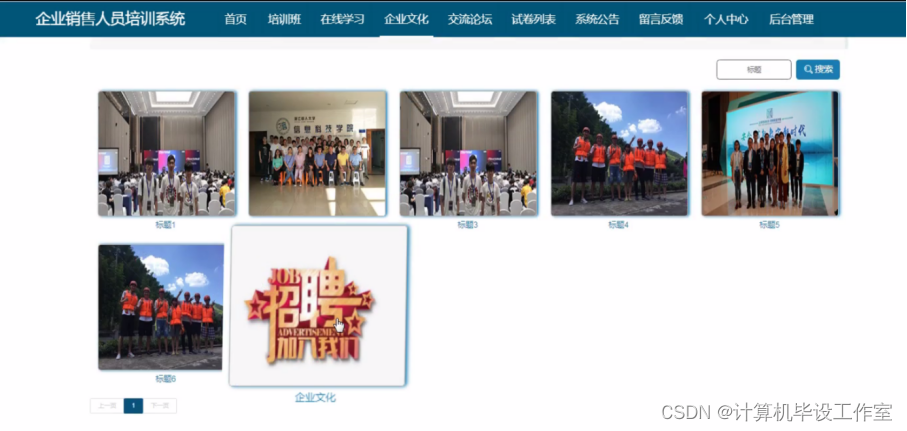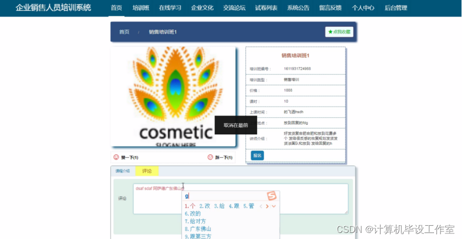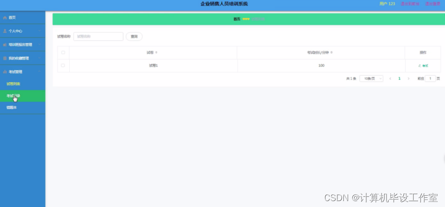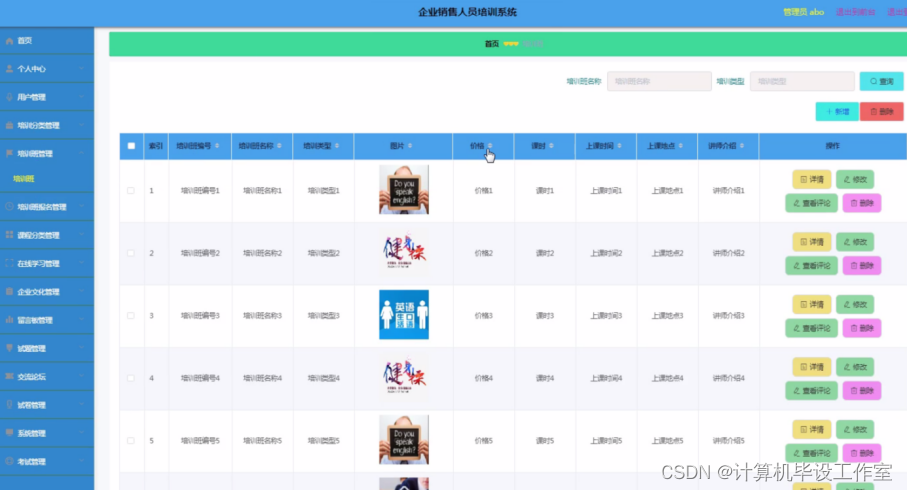 企业销售人员培训系统,主要的模块包括查看;管理员;个人中心、用户管理、培训分类管理、培训班管理、培训班报名管理、课程分类管理、在线学习管理、企业人员培训管理、留言板管理、试题管理、交流论坛、试卷管理、系统管理、考试管理。用户;首页、个人中心、培训班报名管理、我的收藏管理、考试管理,前台首页;首页、培训班、在线学习、企业人员培训、交流论坛、试卷列表、系统公告、留言反馈、个人中心、后台管理等功能。系统中管理员主要是为了安全有效地存储和管理各类信息,还可以对系统进行管理与更新维护等操作,并且对后台有相应的操作权限。