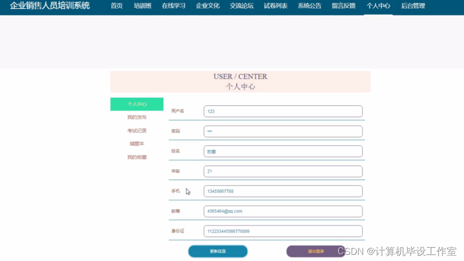 用户注册/登陆:通过填写用户名、密码、姓名、年龄、手机、邮箱、身份证等信息,输入完成后选择登录输入用户名、密码即可进入企业销售人员培训系统,如图5-8所示。