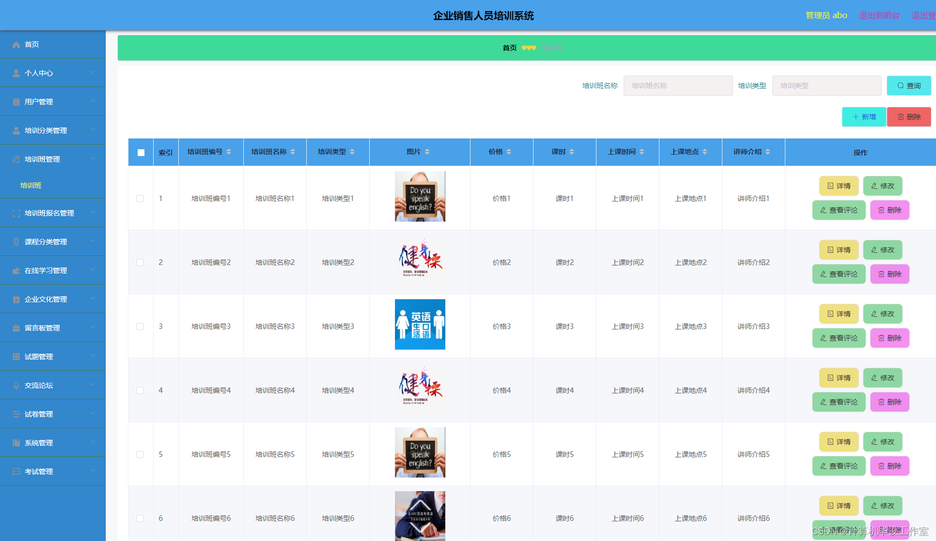 培训班管理:管理员对培训班管理进行添加培训班编号、培训班名称、培训类型、图片、价格、课时、上课时间、上课地点、讲师介绍可以进行删除、修改以及查看等操作。程序效果图如下图5-3所示: