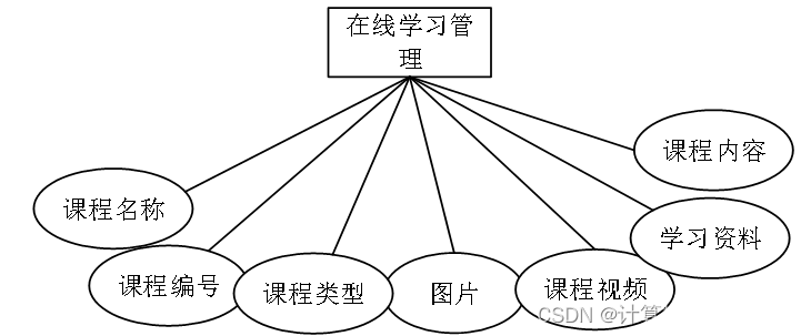 2、在线学习管理:课程名称、课程编号、课程类型、图片、课程视频、学习资料、课程内容实体图如图4-8所示: