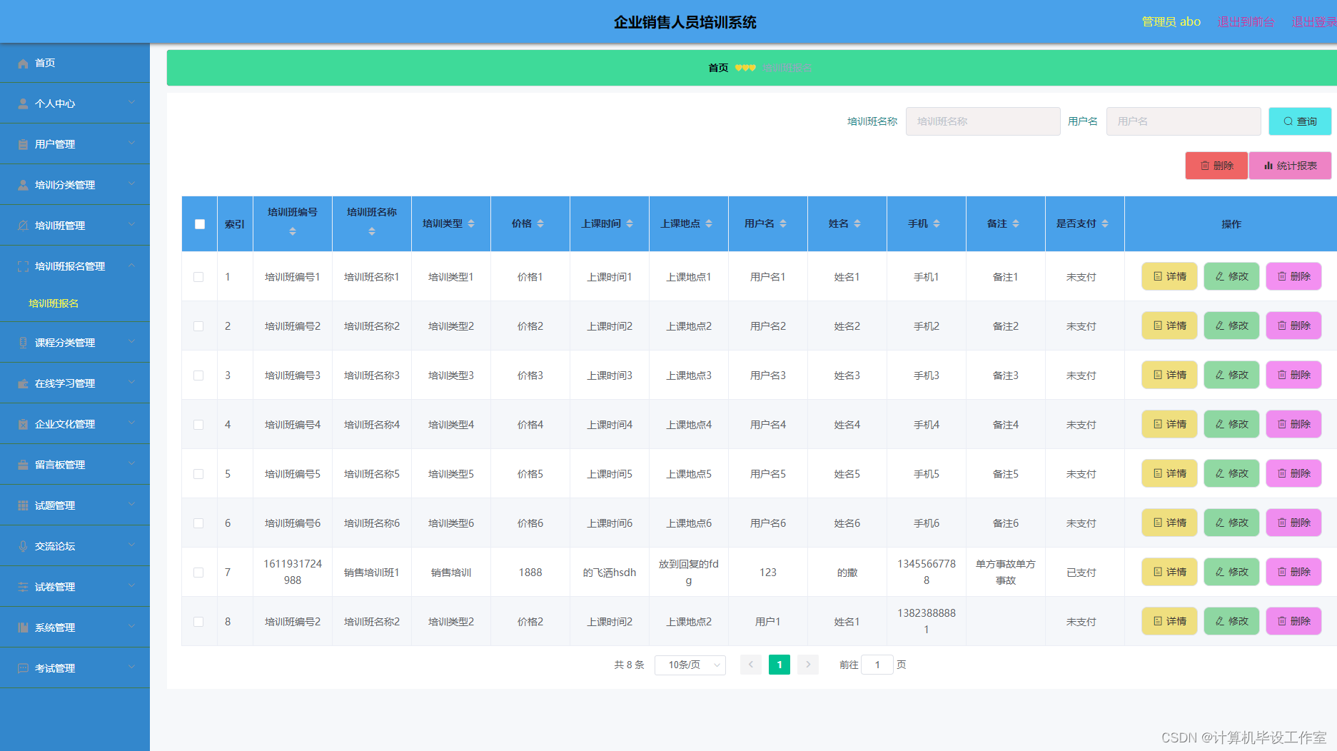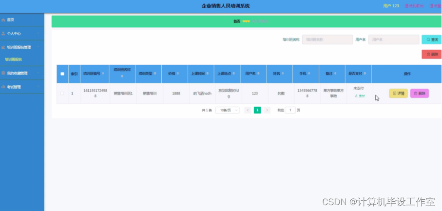 培训班报名管理:进入培训班报名管理可以查看培训班编号、培训班名称、培训类型、价格、上课时间、上课地点、用户名、姓名、手机、支付等等信息,并可以进行查看详情、删除等操作。程序效果图如下图5-15所示: