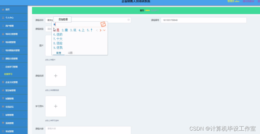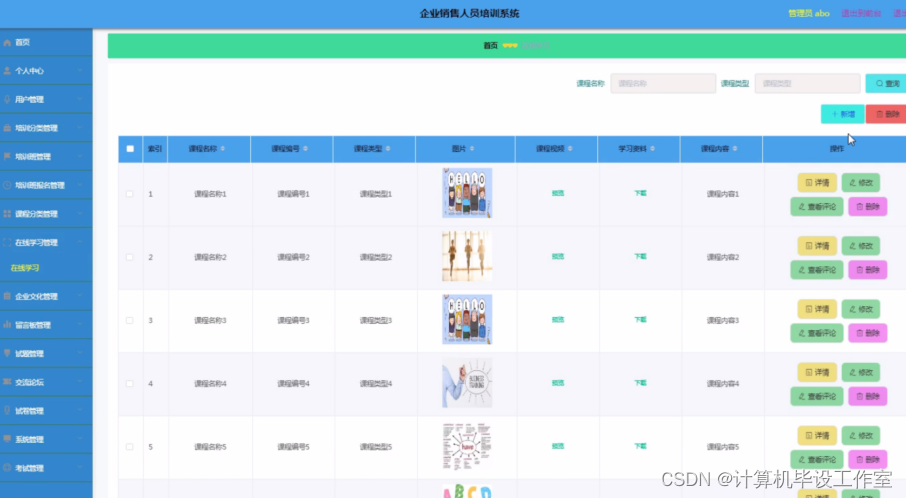 在线学习管理:管理员对在线学习管理进行添加课程名称、课程编号、课程类型、图片、课程视频、学习资料、课程内容并修改以及删除等操作。程序效果图如下图5-4所示: