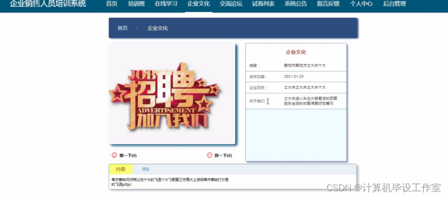 企业文化:通过前台首页查看企业文化信息评论、点解等操作。程序效果图如下图5-12所示: