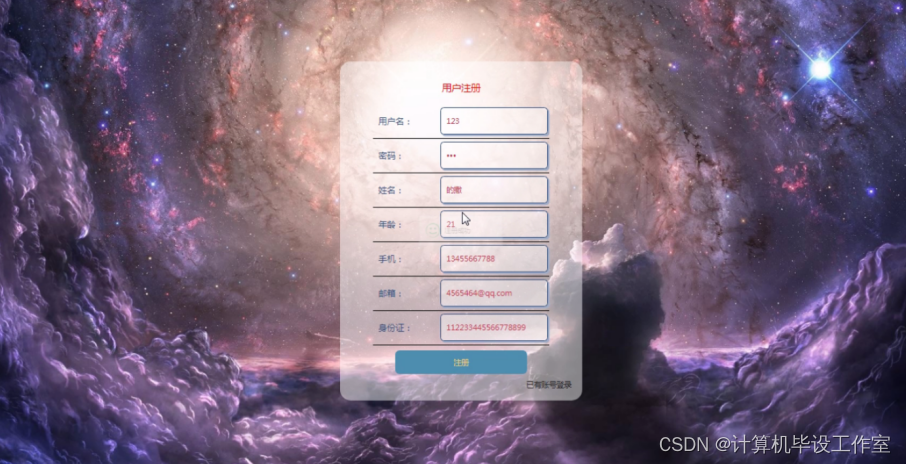 用户可以对个人信息进行编辑用户名、密码、姓名、年龄、手机、邮箱、身份证进行添加、修改、删除等操作。程序效果图如下图5-14所示: