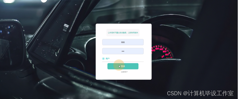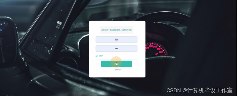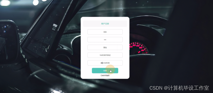 用户注册/登陆,通过填写用户名、密码、姓名、性别、头像、联系电话、车牌号等信息,输入完成后选择登录输入用户名、密码即可进入停车场管理系统,如图5-8所示。
