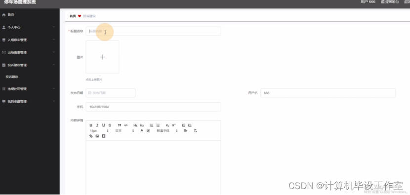 用户后台,用户进入后台查看列表可以获取首页、个人中心、入场停车管理、出场缴费管理、投诉建议管理、违规处罚管理、我的收藏管理等操作,如图5-14所示。