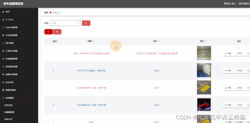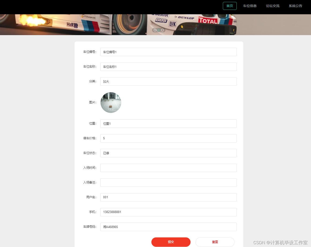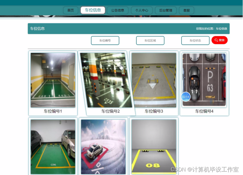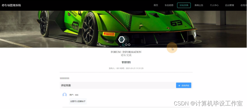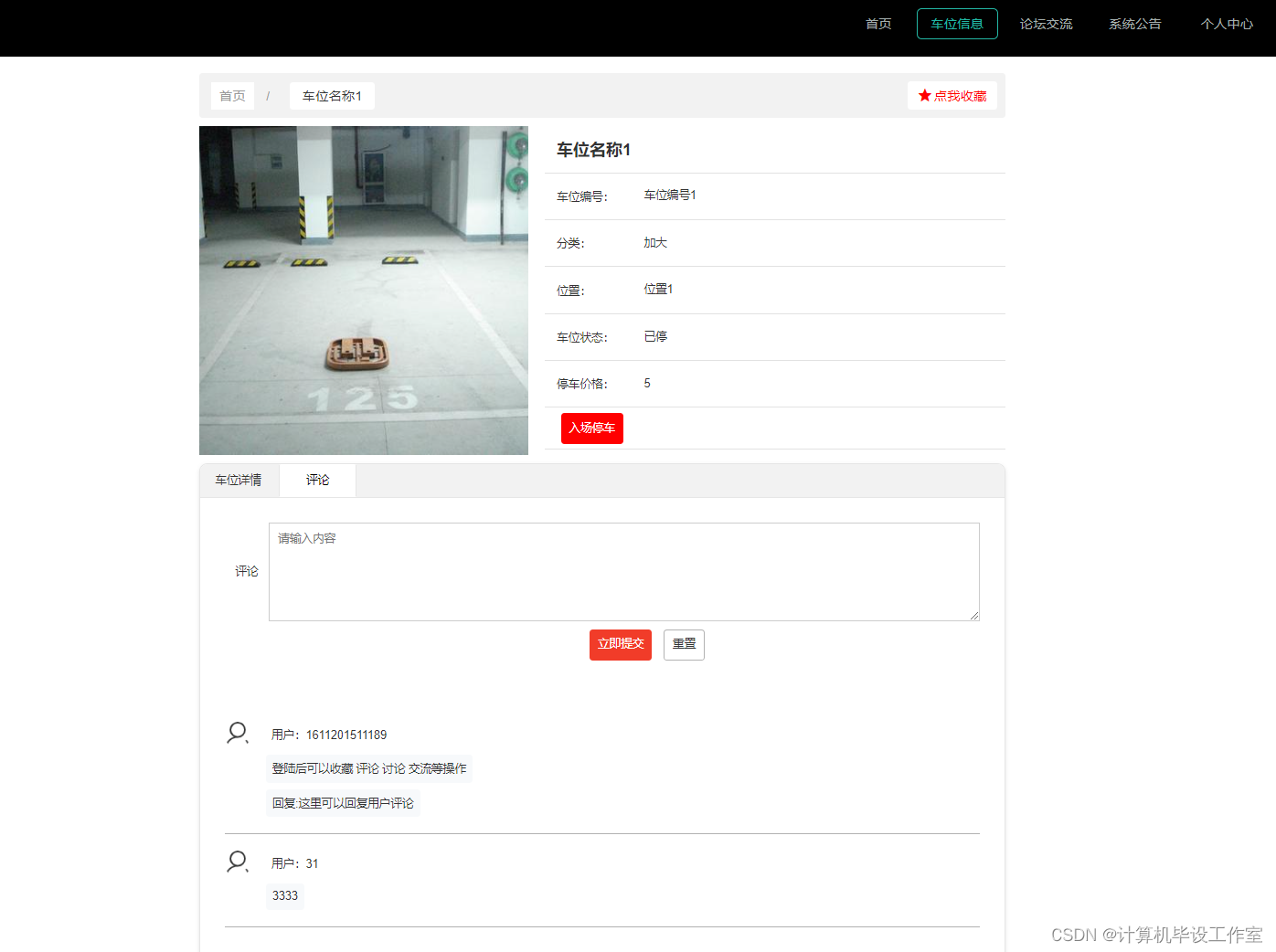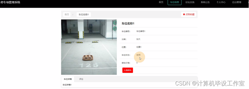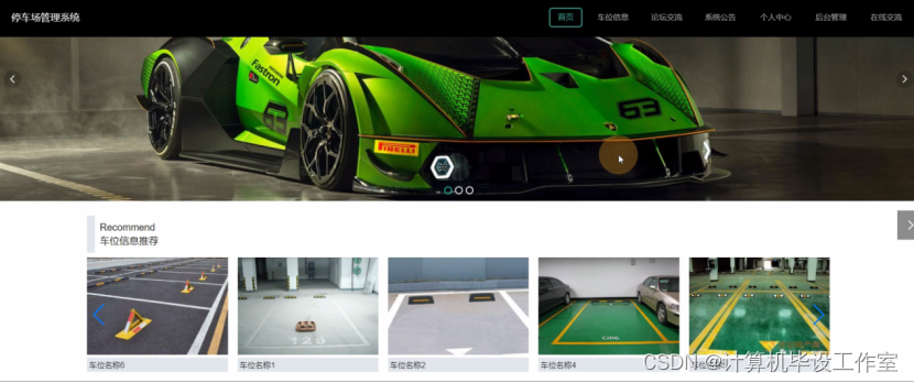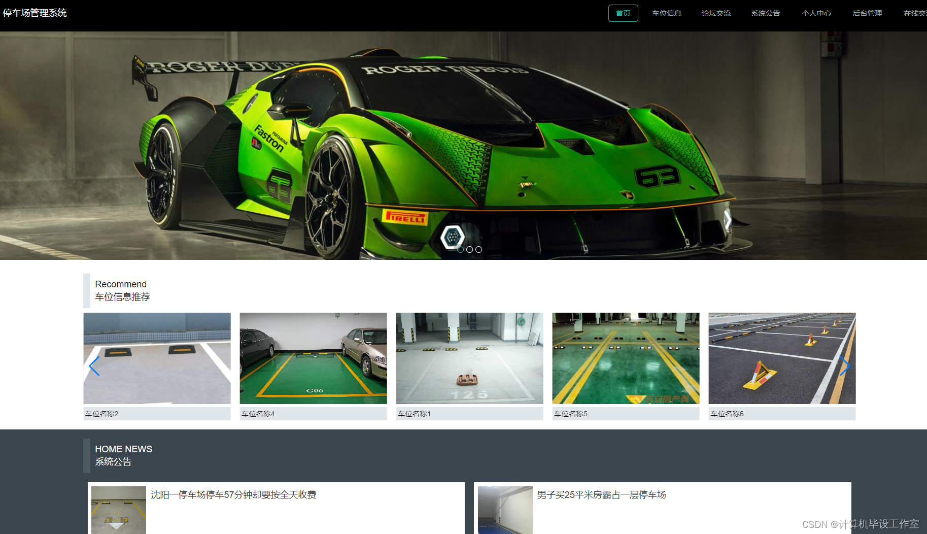前台首页:首页、车位信息、论坛交流、系统公告、个人中心、后台管理、在线交流等等信息。