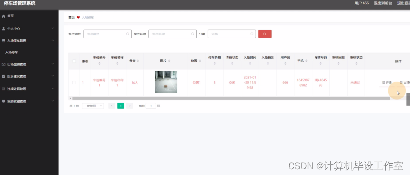 入场停车管理,在入场停车管理页面可以查看车位编号、车位名称、图片、位置、停车价格、车位状态、入场时间、入场备注、用户名、手机、车牌号码、审核回复、审核状态等内容,并可根据需要对入场停车管理查看详细内容等操作,如图5-17所示。