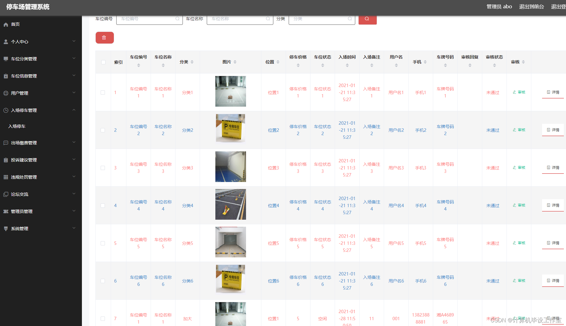 3、功能的完善性:可以管理管理员;首页、个人中心、车位分类管理、车位信息管理、用户管理、入场停车管理、出场缴费管理、投诉建议管理、违规处罚管理、论坛交流、管理员管理、系统管理。